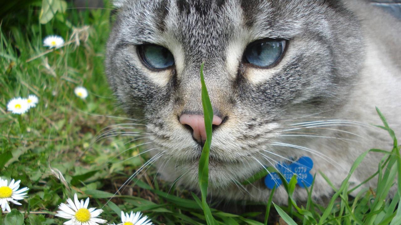 Wallpaper Grey cat looking for grass