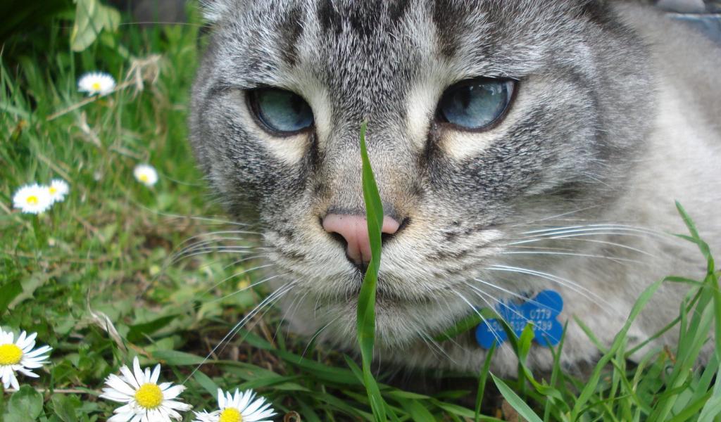 Wallpaper Grey cat looking for grass