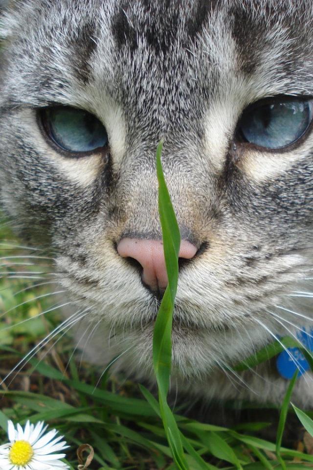 Wallpaper Grey cat looking for grass
