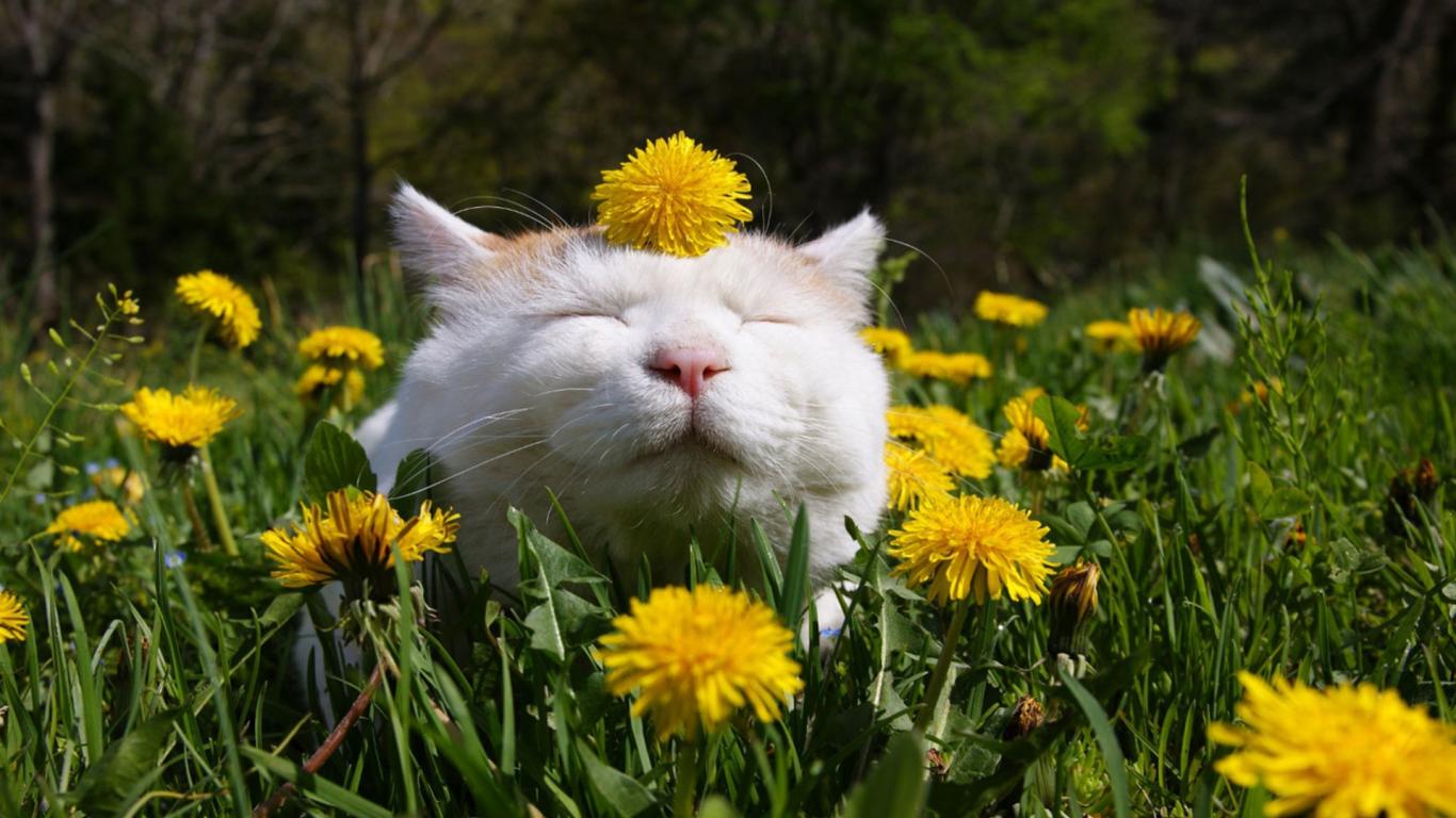 Wallpaper Funny white cat in dandelions