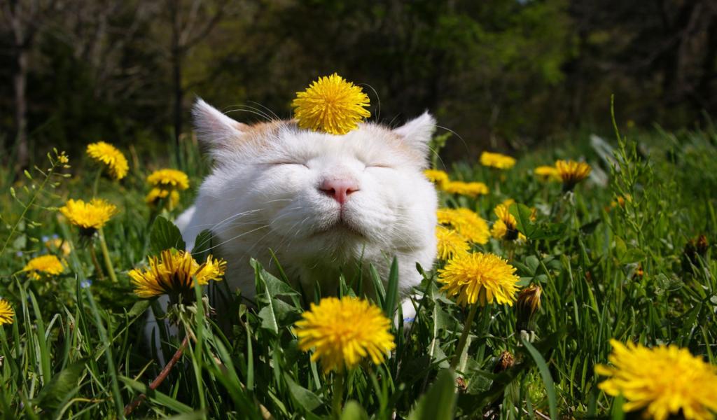 Wallpaper Funny white cat in dandelions