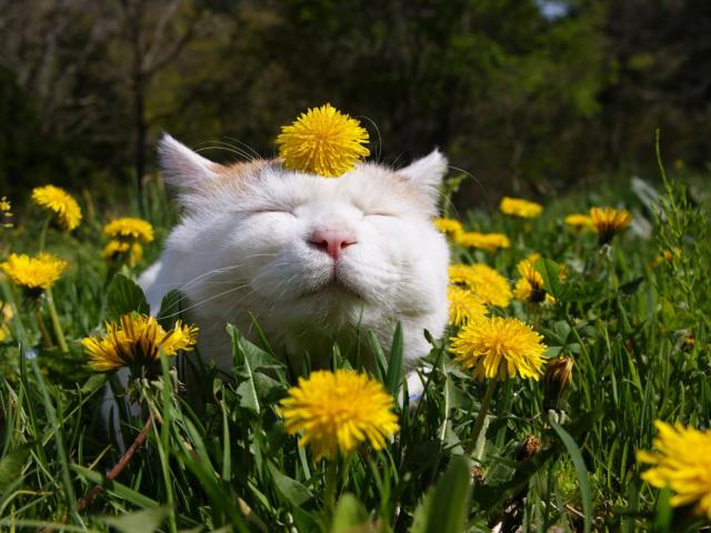 Wallpaper Funny white cat in dandelions