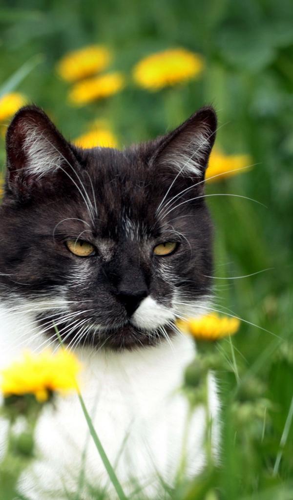 Wallpaper A beautiful black and white cat in dandelions