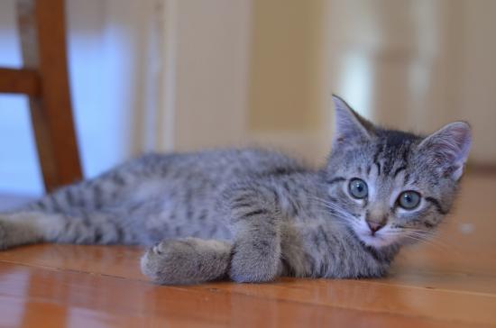 Wallpaper Playful young gray cat on the floor