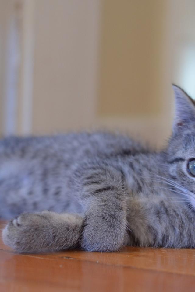Wallpaper Playful young gray cat on the floor