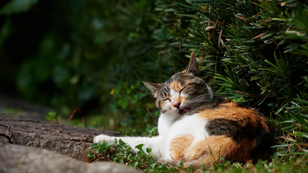 Wallpaper Multi-colored cat licks in the bushes
