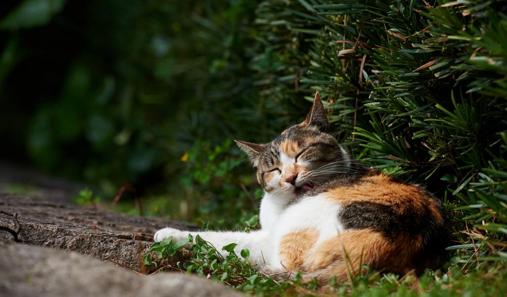 Wallpaper Multi-colored cat licks in the bushes