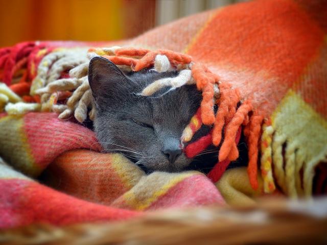 Wallpaper Gray cat basks in the bedspread