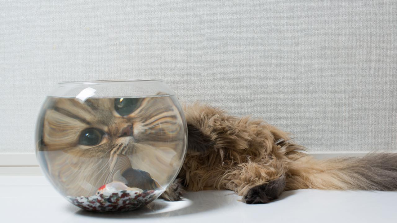 » Wallpaper Fluffy cat and a fish, acquaintance