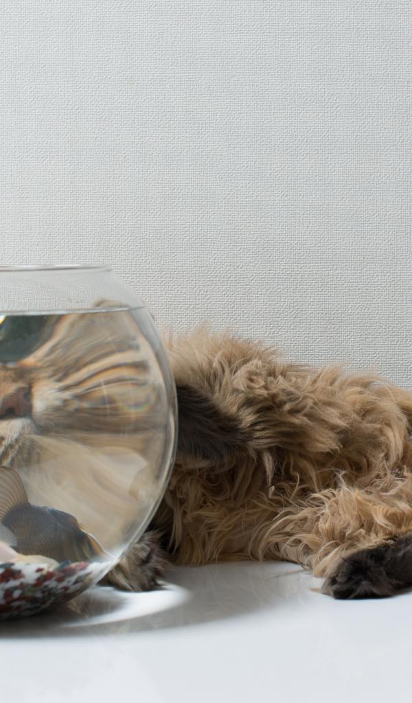 » Wallpaper Fluffy cat and a fish, acquaintance