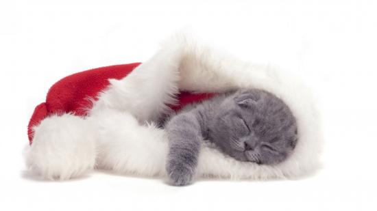 Wallpaper Small Scottish Fold cat is sleeping in a Christmas hat
