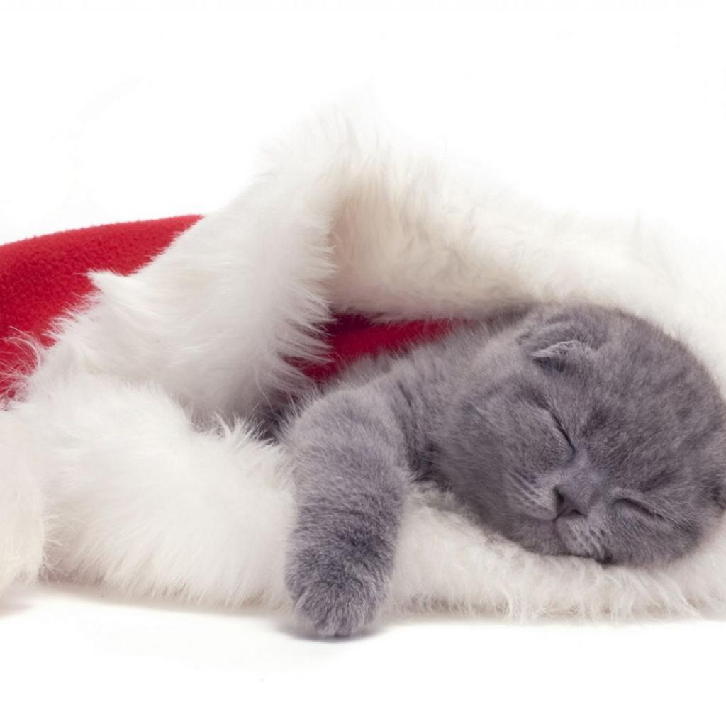 Wallpaper Small Scottish Fold cat is sleeping in a Christmas hat