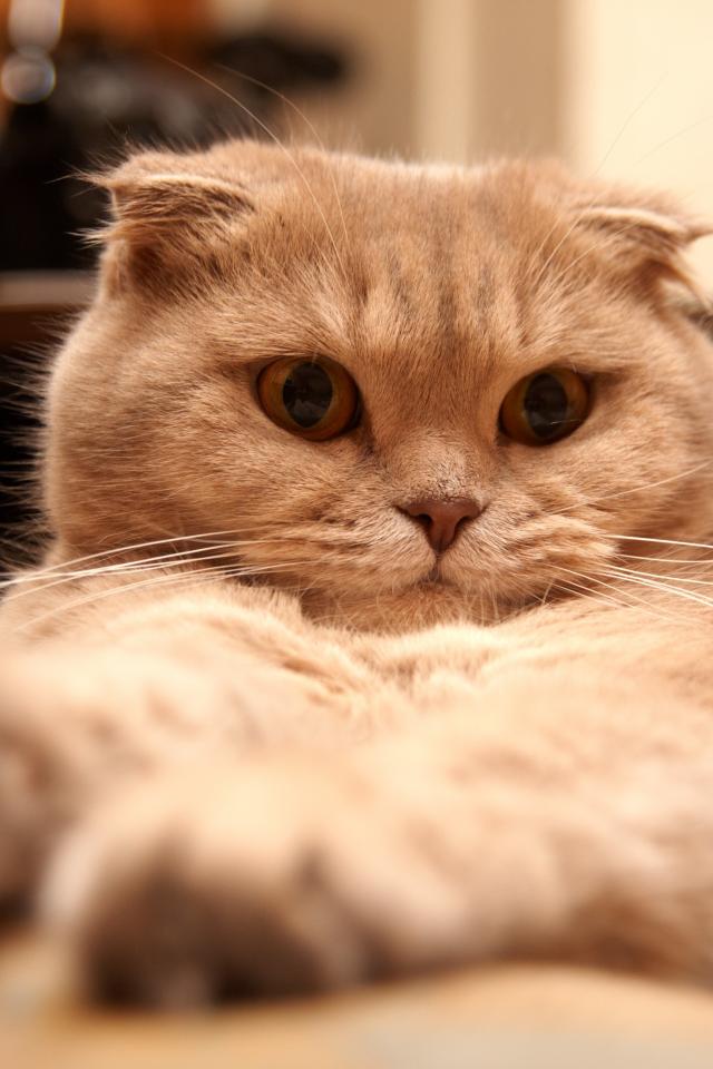 Wallpaper Beautiful Scottish Fold with green eyes on the bed