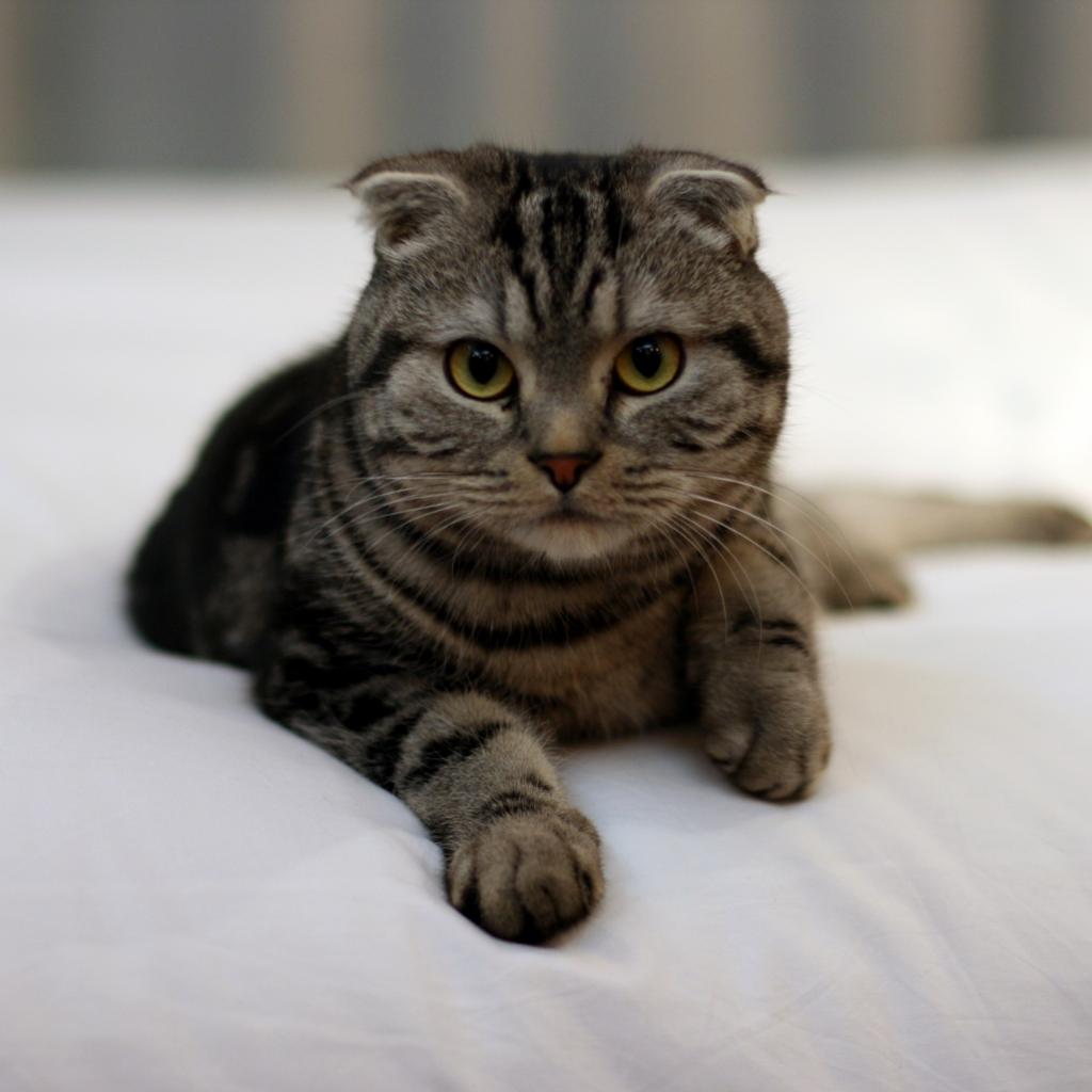 Wallpaper Beautiful Scottish Fold with green eyes on the bed