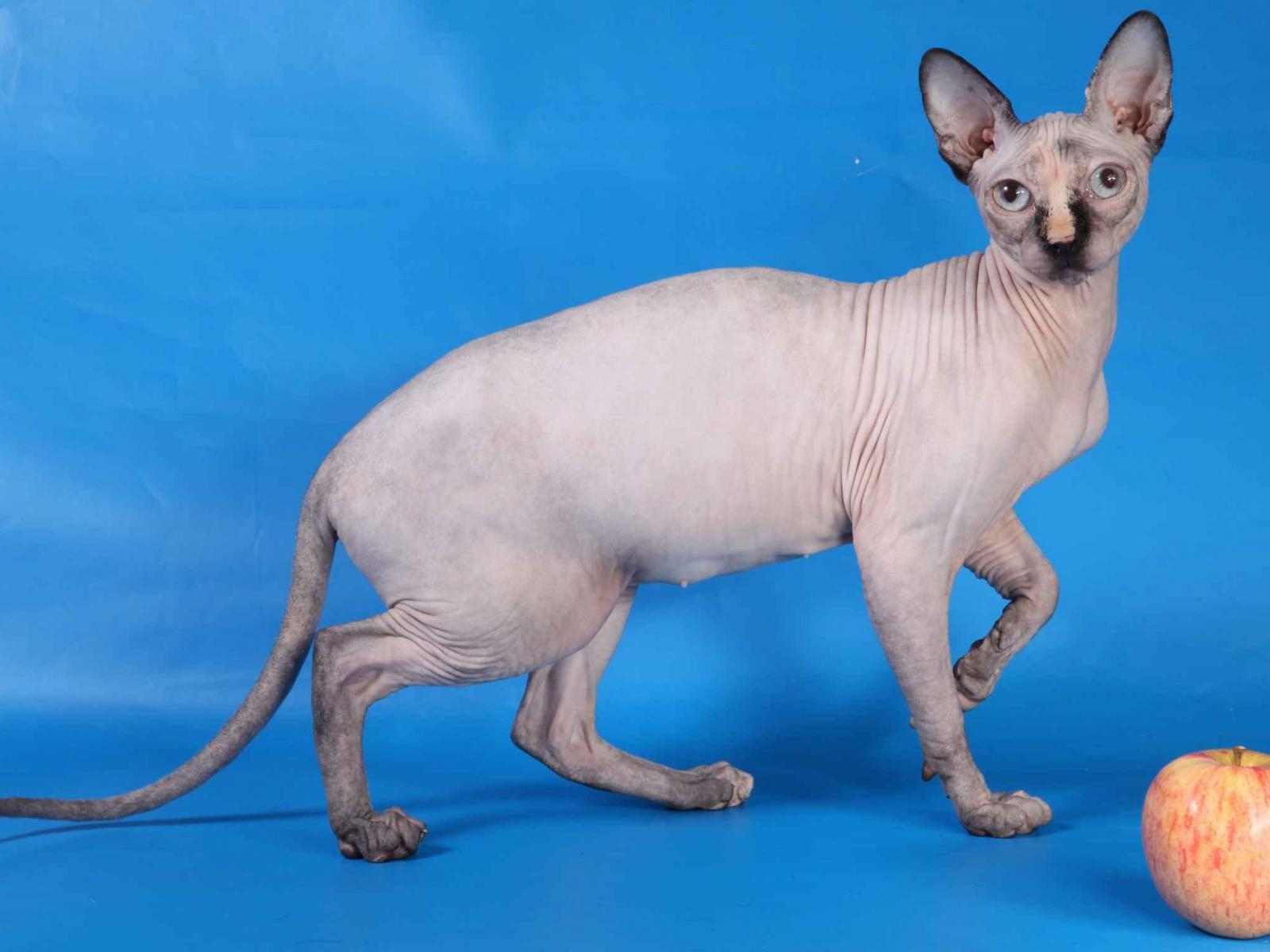 Wallpaper Sphynx cat and an apple on a blue background
