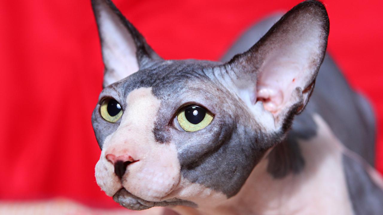 Wallpaper Sphynx cat with green eyes on a red background