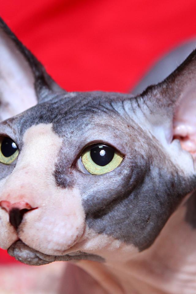 Wallpaper Sphynx cat with green eyes on a red background