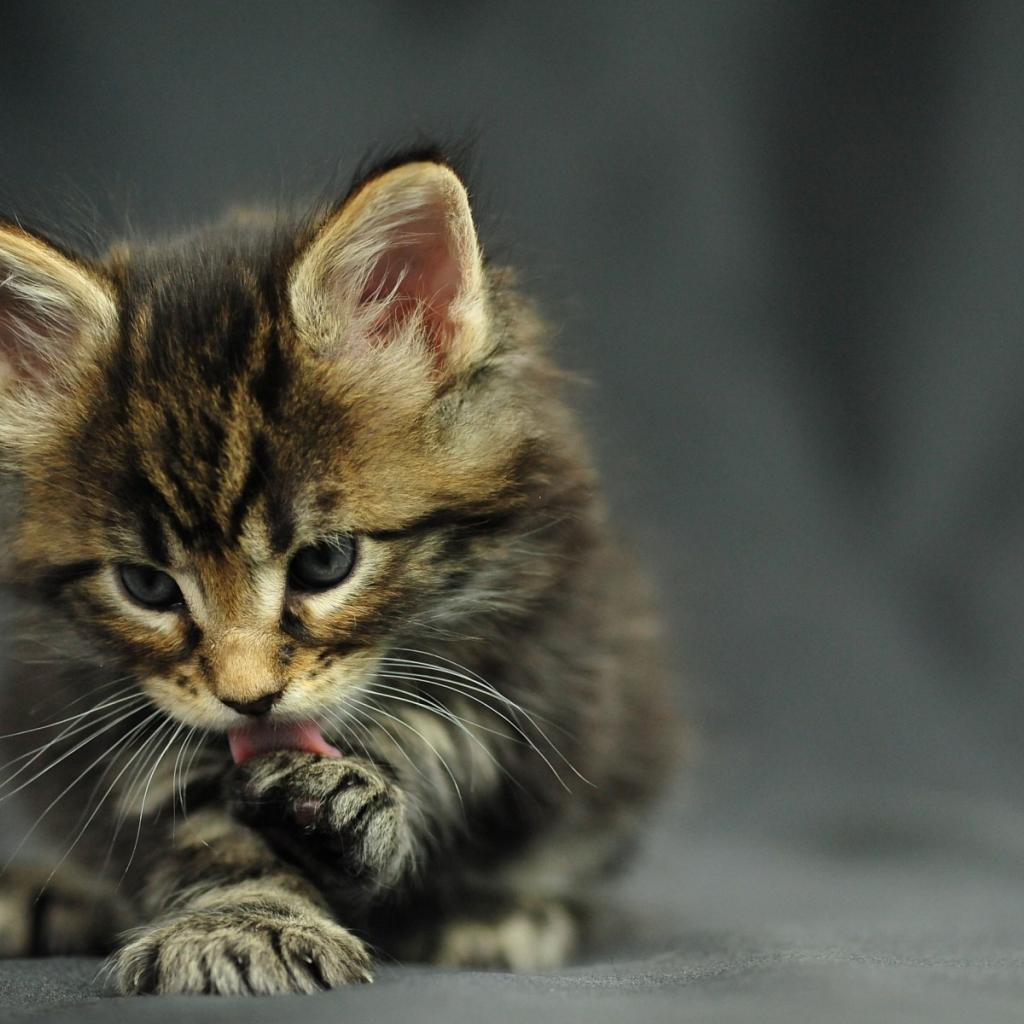 Wallpaper Small beautiful Maine Coon cat licking its paw