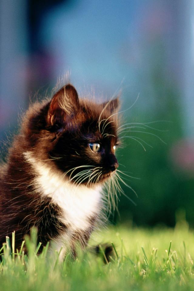 Wallpaper Small furry black cat with a white chest on the grass