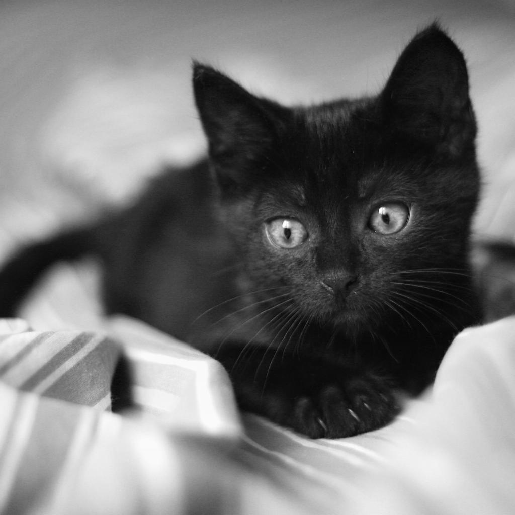 Wallpaper Beautiful little black cat lying on the bed
