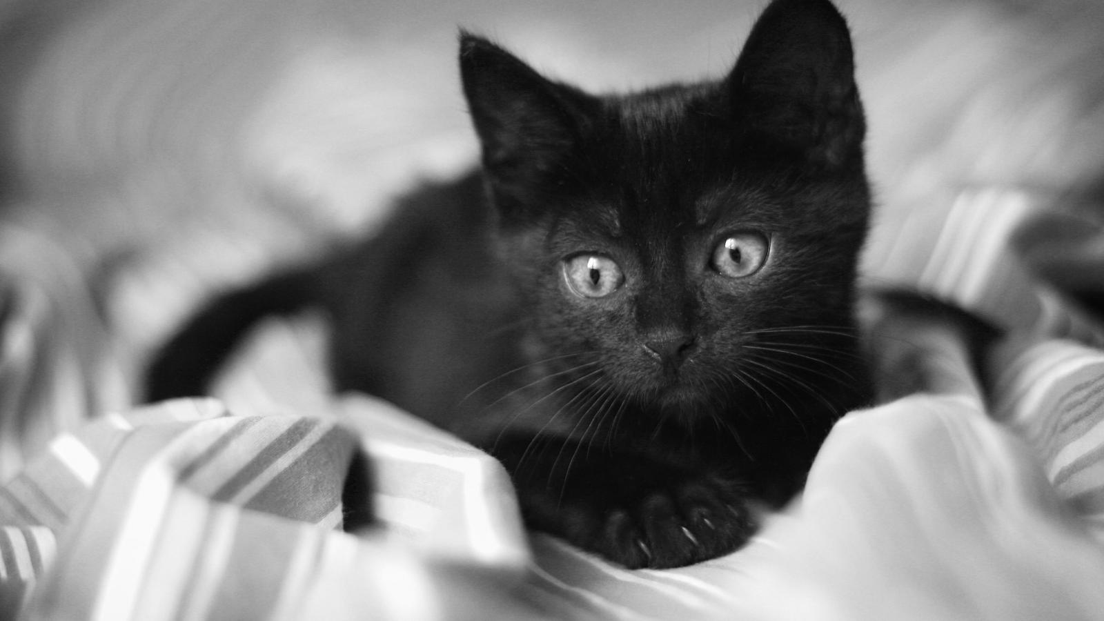 Wallpaper Beautiful little black cat lying on the bed