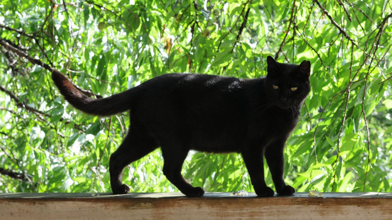 Wallpaper Black cat on a fence under the tree
