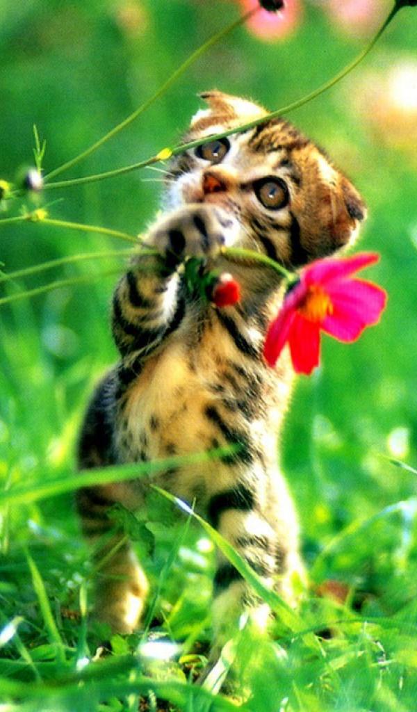Wallpaper Kitten plays flowers