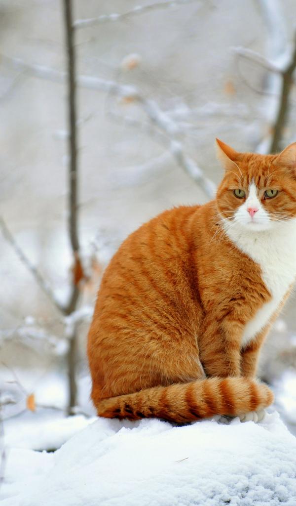 Wallpaper Red Cat sitting on a snowbank in winter