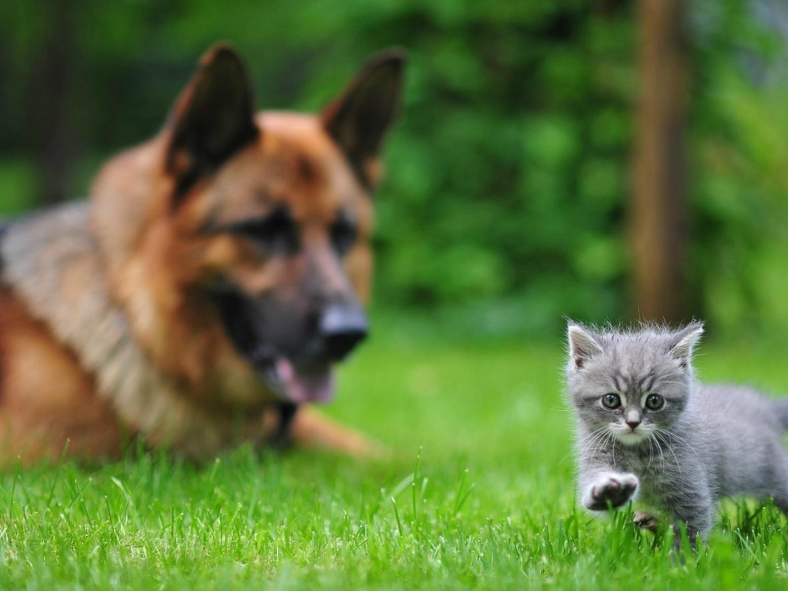 Wallpaper Small cat and a large dog, the first steps