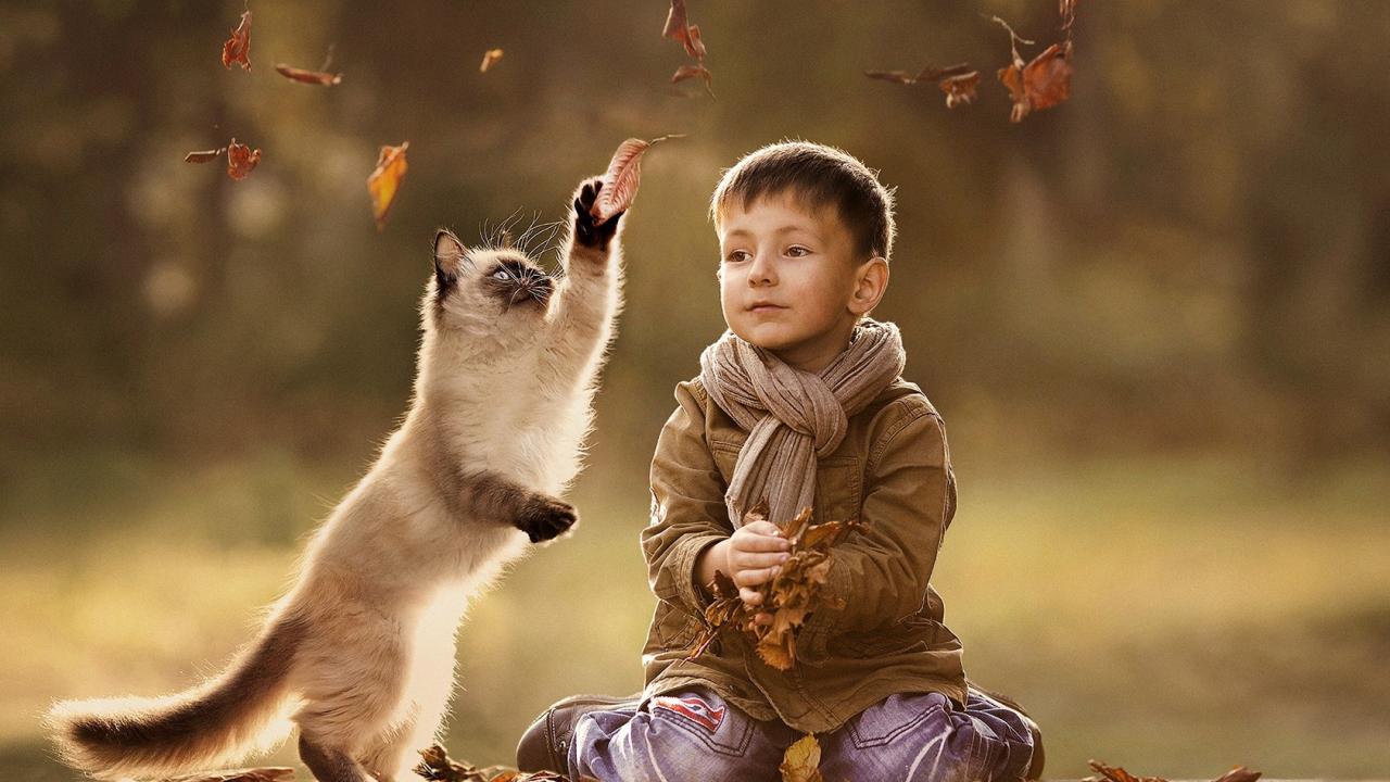 Wallpaper A child playing with a cat