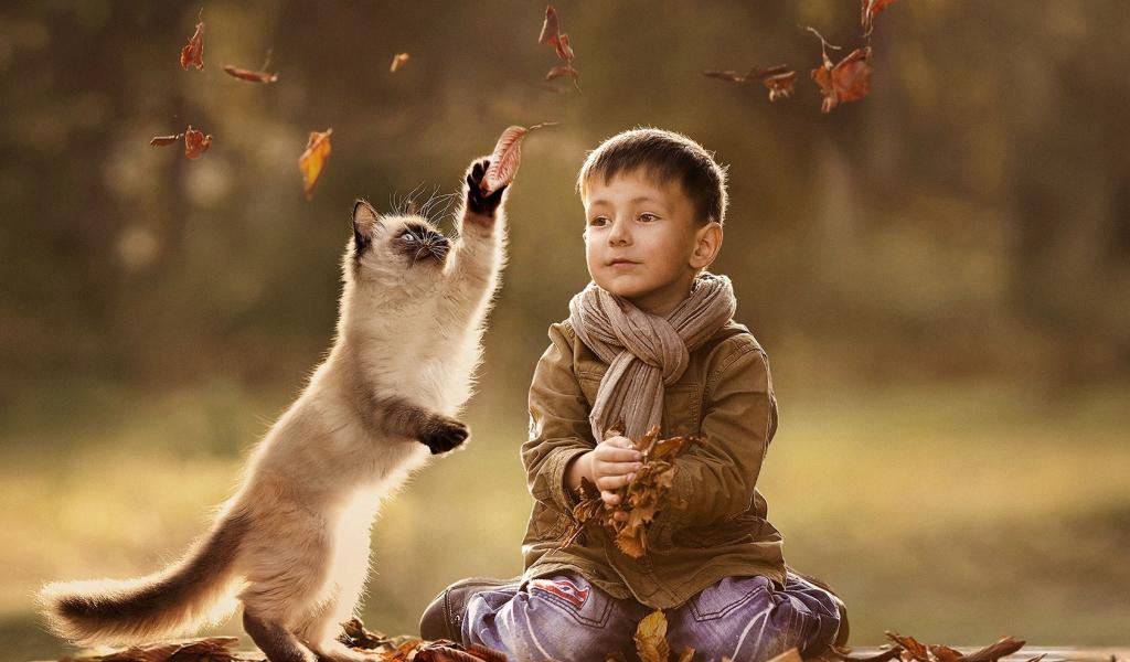 Wallpaper A child playing with a cat