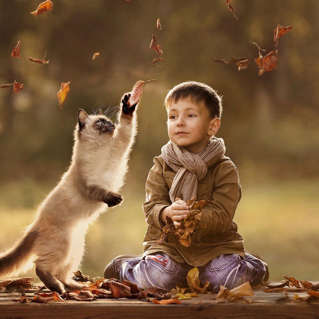 » Wallpaper Child and cat playing together