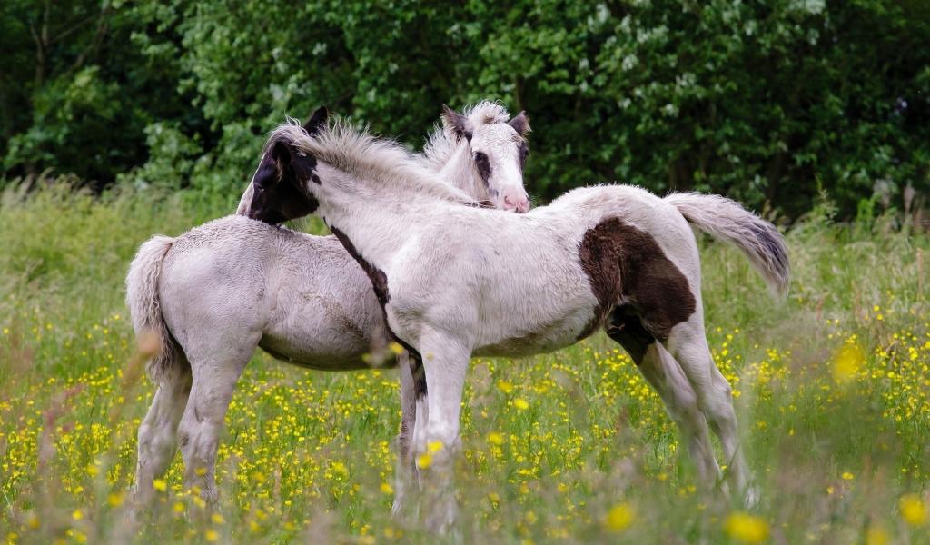 Wallpaper Young horses on a field of yellow flowers