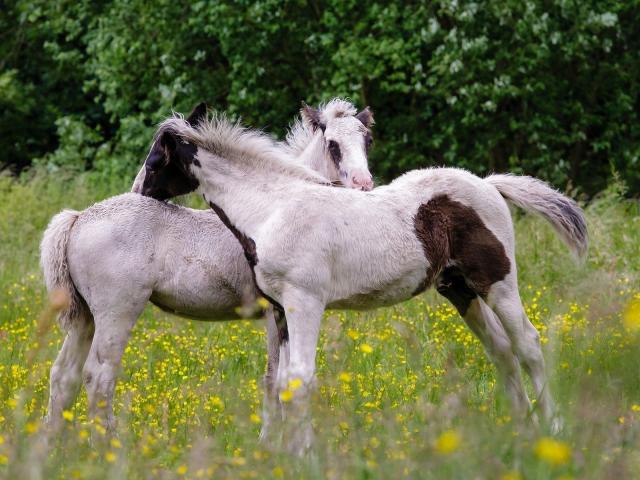 Wallpaper Young horses on a field of yellow flowers