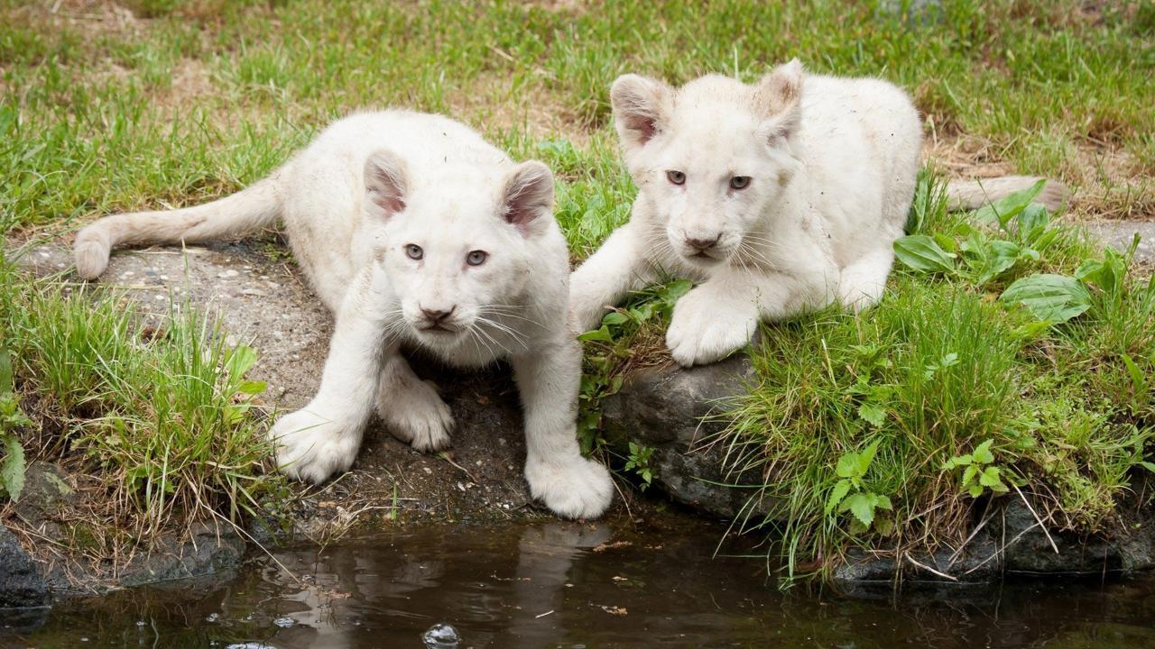 Wallpaper Albino lion cubs at the watering