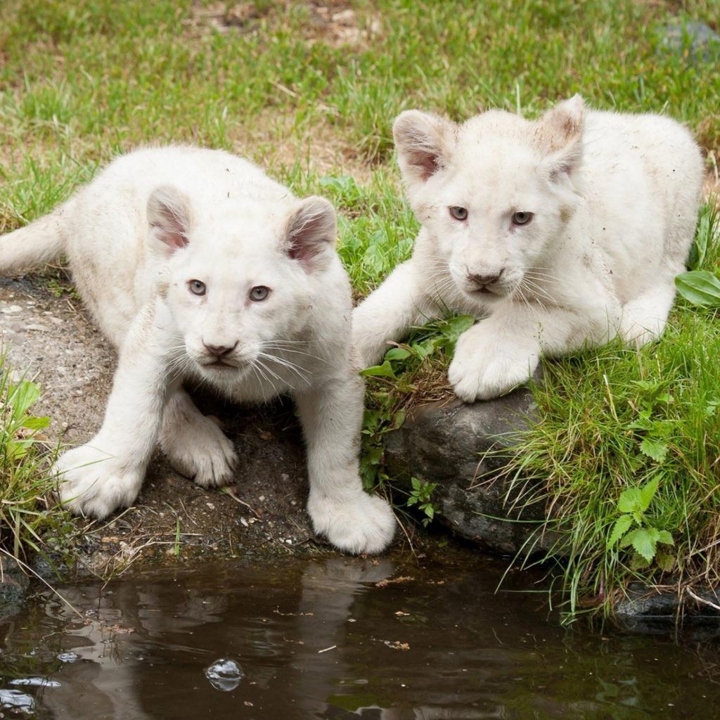 Wallpaper Albino lion cubs at the watering