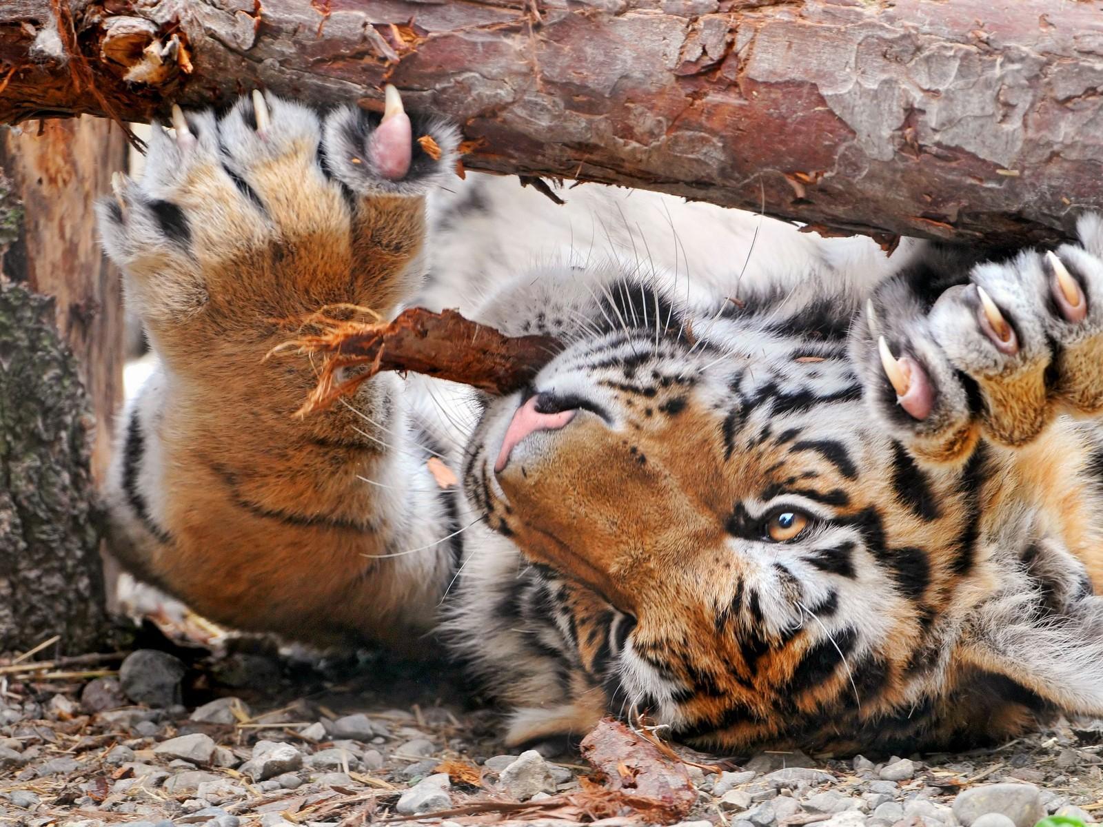 Wallpaper Tiger sharpens claws supine