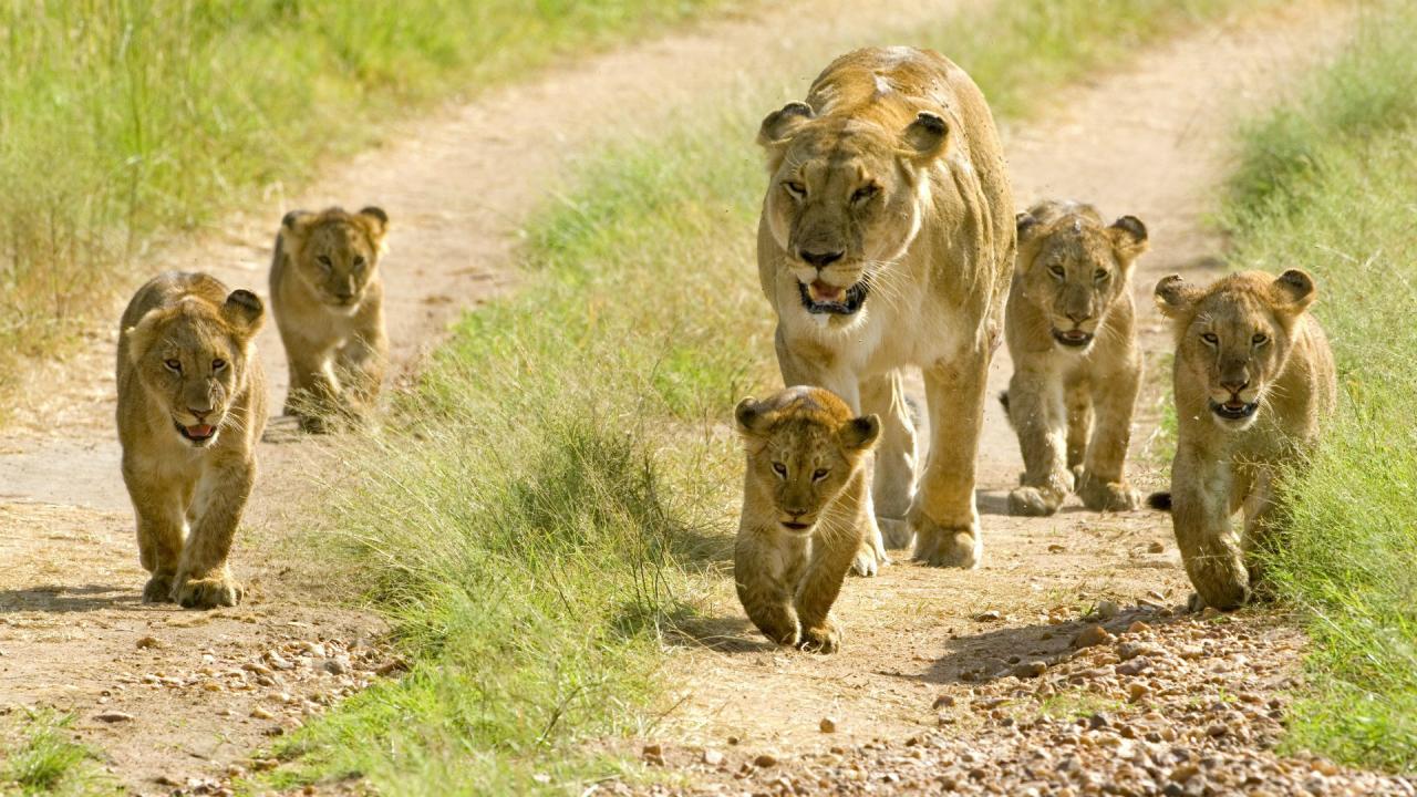 Wallpaper Lioness with cubs walking along the road