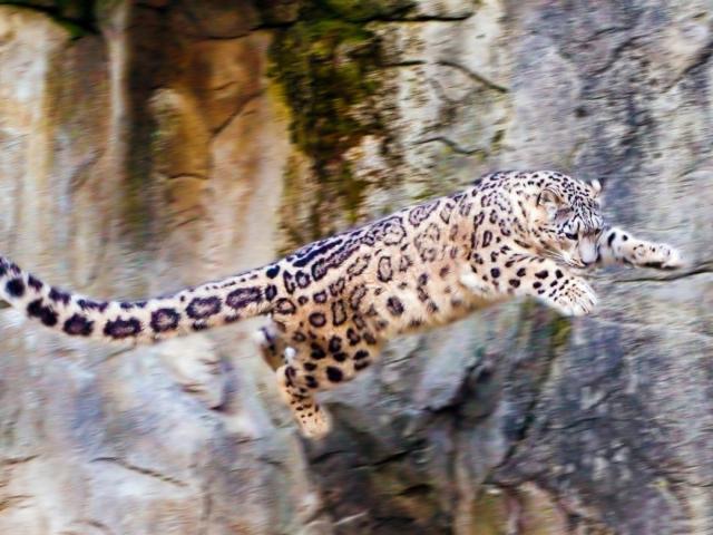 Wallpaper Snow leopard jumping off a cliff