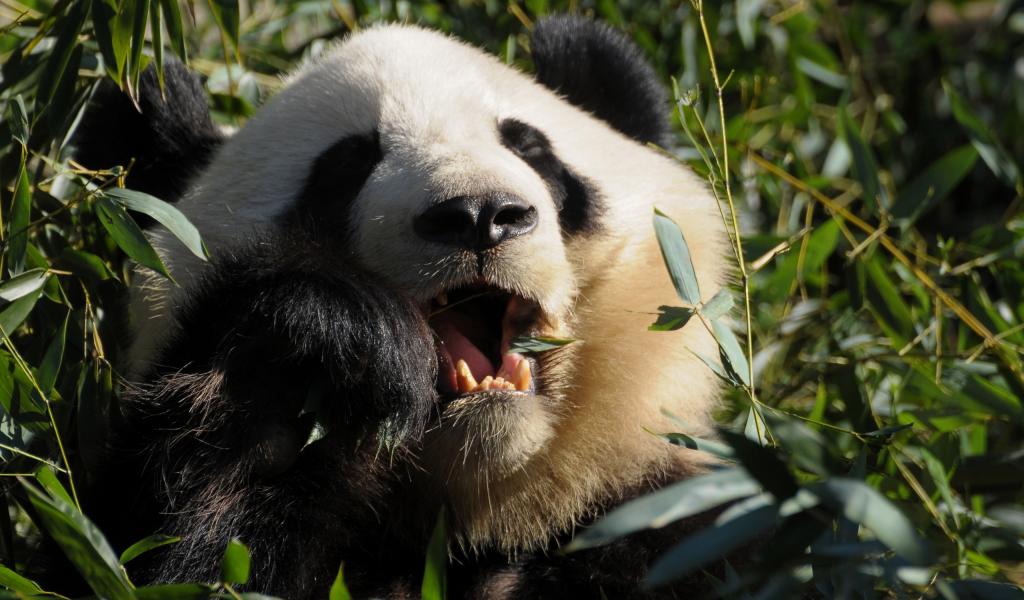 Wallpaper Panda eats leaves among thickets