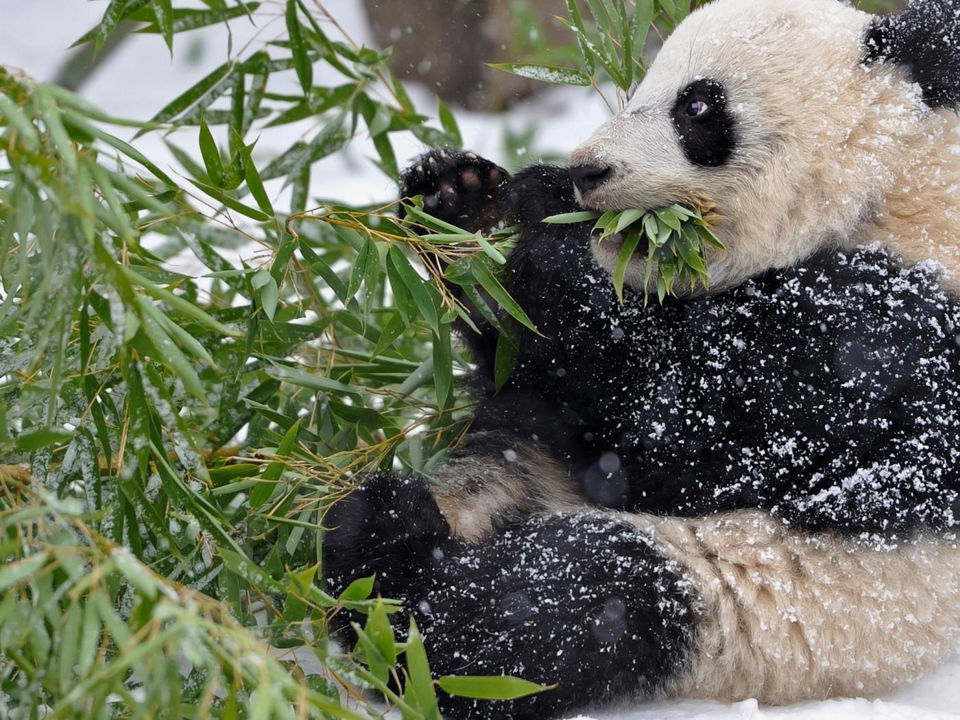 Wallpaper Panda in the snow eating green leaves