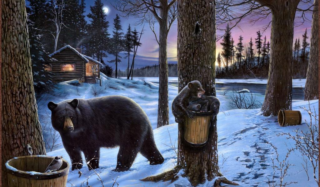 Wallpaper Bear with cubs near the hut of the forester