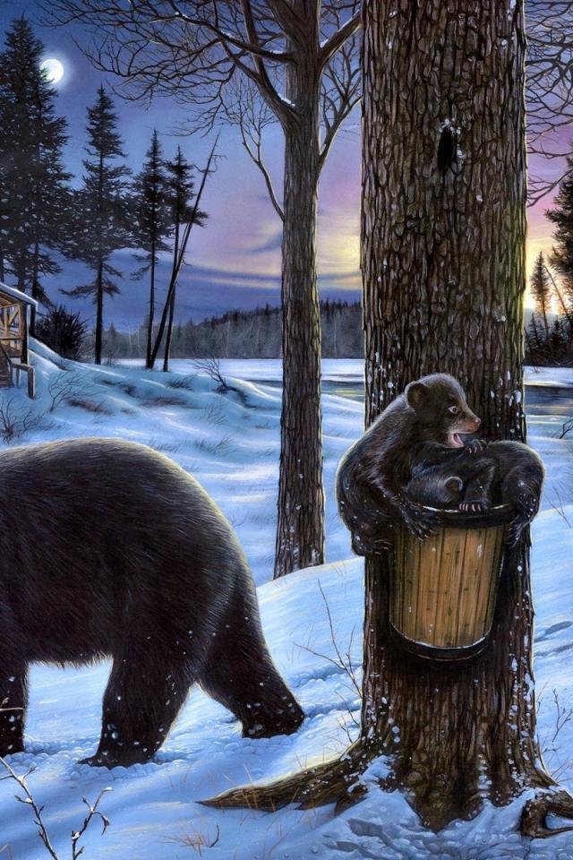 Wallpaper Bear with cubs near the hut of the forester