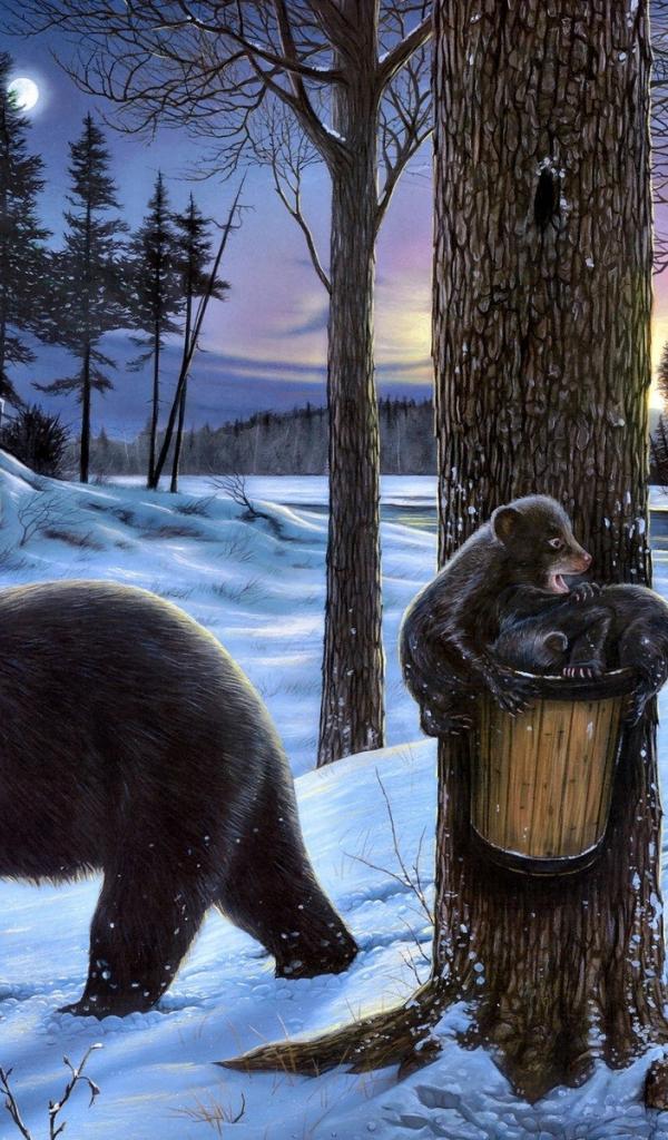 Wallpaper Bear with cubs near the hut of the forester
