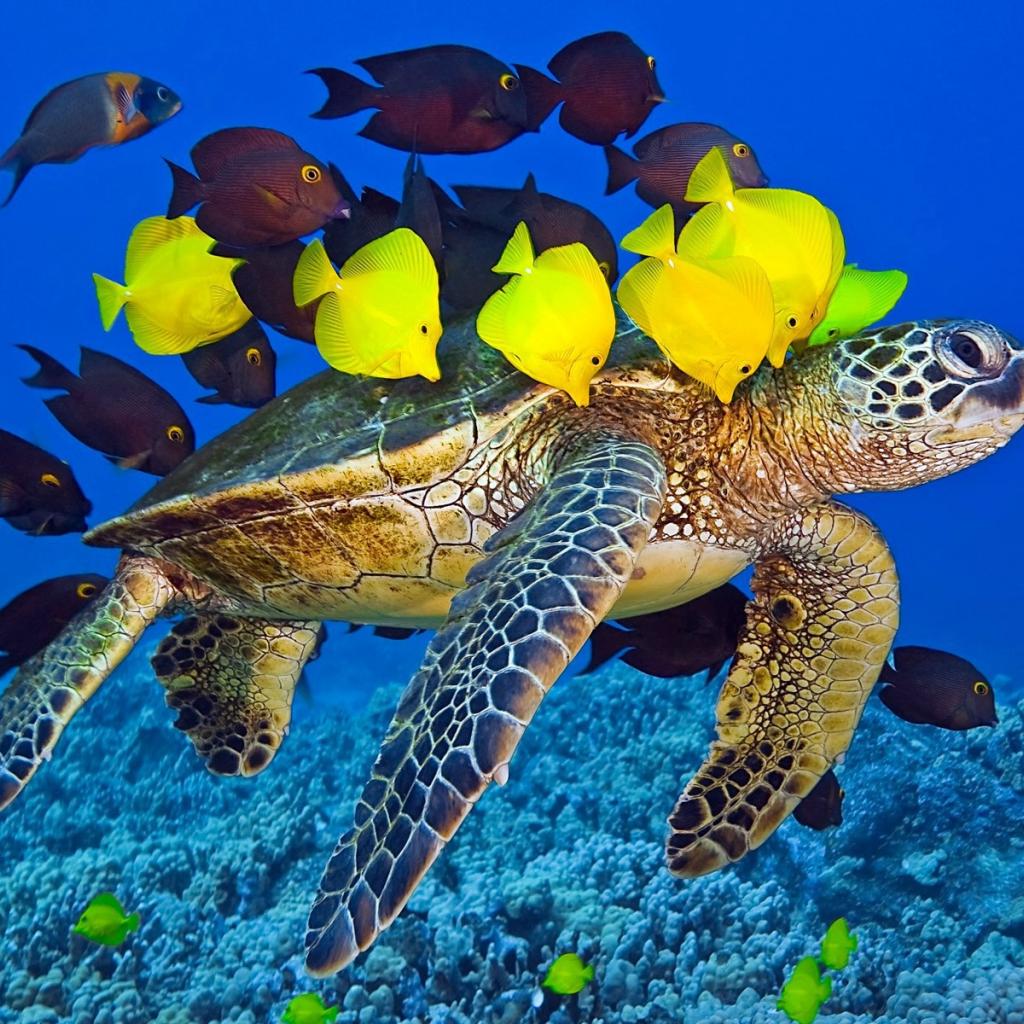 Wallpaper Turtle swims surrounded by yellow fish