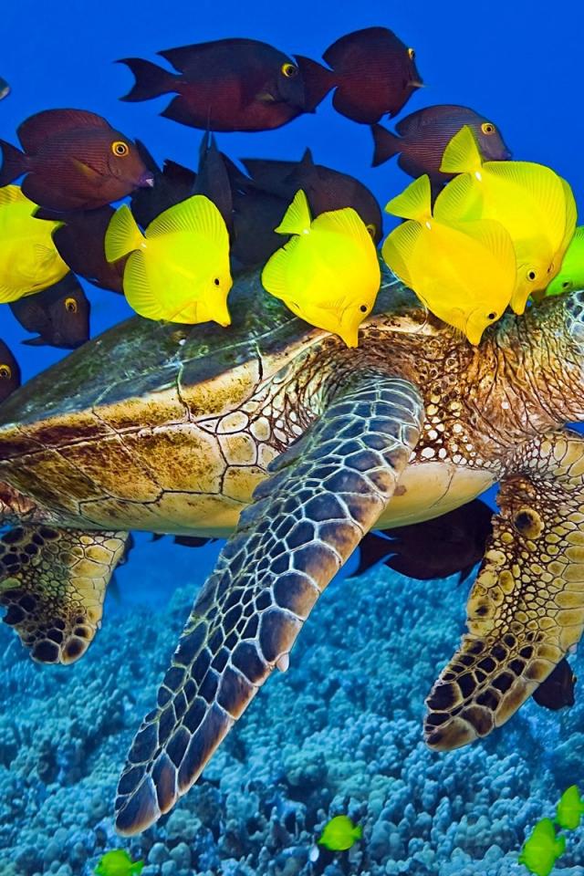 Wallpaper Turtle swims surrounded by yellow fish