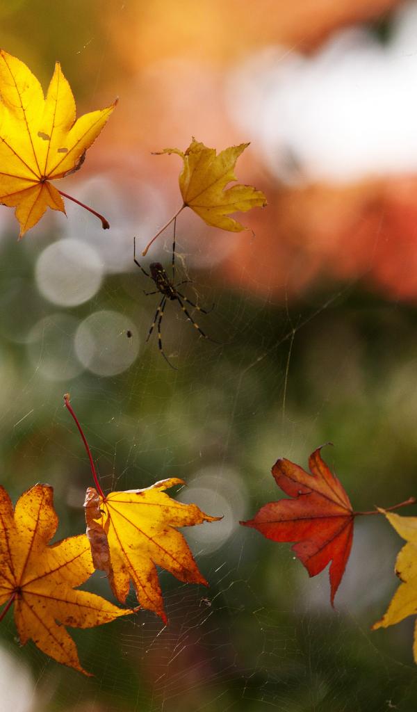 Wallpaper Leaves, spider, spiderweb, Macro, Autumn leaves
