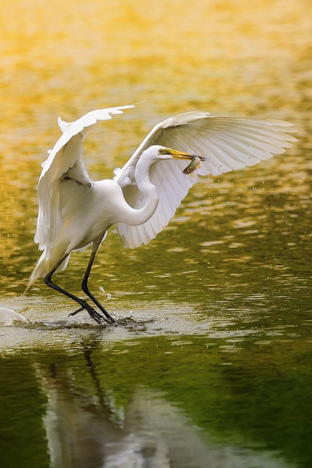 Wallpaper White heron caught a fish and was going to fly away