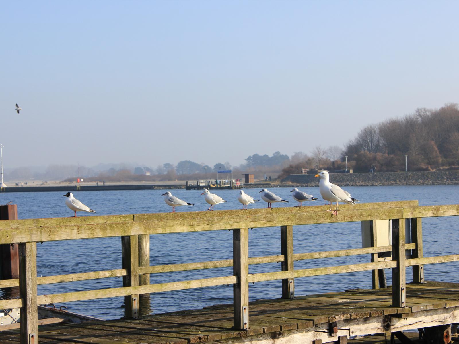 Wallpaper Seagulls sitting on the wooden railing of the pier
