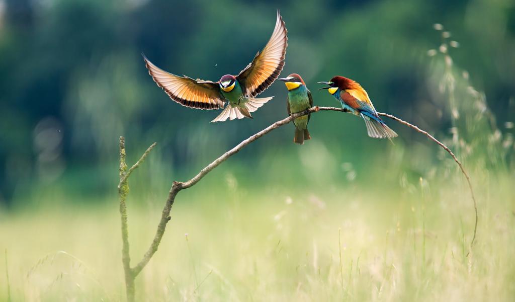 Wallpaper Three colorful bee-eater on a branch in the field